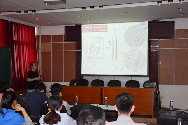 在特邀报告环节,李鹏、董国徽两位老师分别以《Unified factor of dislocation evolution in fatigued fcc crystals》、《MIEC perovskite for Solid Oxide Fuel Cells (SOFC) Anode materials.》为主题,进行了英文专题交流汇报,两位老师的高水平学术报告引起了参会师生们的浓厚兴趣和热切关注,同学们深深学习和感受到老师们缜密的思维和严谨的科研态度。在讨论时间里,大家纷纷就相关问题进行提问,两位老师耐心地进行了详细解答,气氛十分热烈。