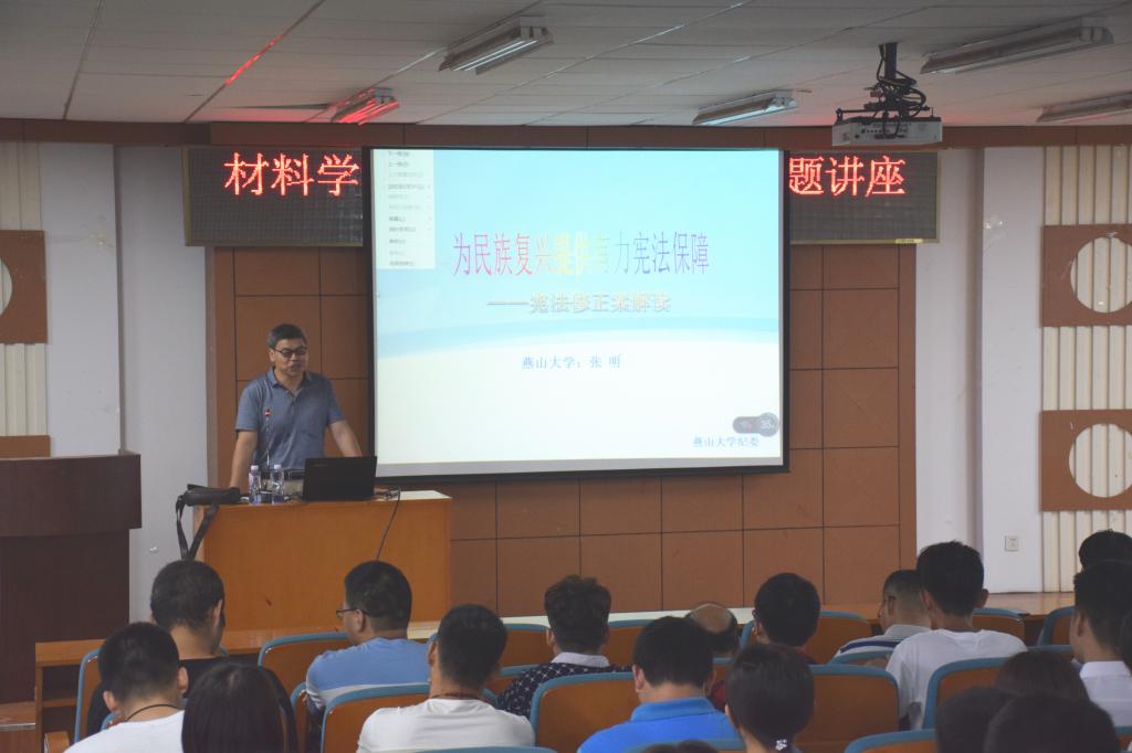 邀请校党委讲师团成员、校纪委副书记、监察审计处处长张明教授,在电院101室作了《为民族复兴提供有力宪法保障——宪法修正案解读》的专题讲座。讲座由学院党委书记王丽萍主持。学院全体党员师生聆听了本场讲座。