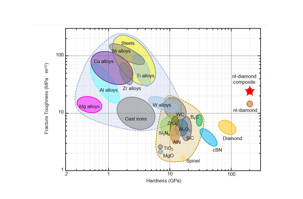 纳米孪晶金刚石复合材料和典型工程材料的硬度和断裂韧性