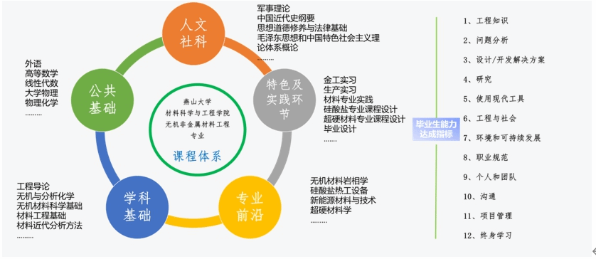 专业以培养具有“宽厚、复合、开放、创新”特征的高素质人才为出发点,结合学院师资队伍科研基础与特色,确定了2个专业培养方向,开设相关公共基础和专业特色课程。课程体系由人文社科、公共基础、学科基础、专业前沿和特色及实践环节等教学模块组成,专业课程划分为超硬材料和硅酸盐2个专业方向模块,教学上强化基础知识的掌握,高度重视创新能力的提升,促进多学科的交叉融合,加强最新科研与教学的联系,及时反映无机非金属领域的最新研究进展,全面提升学生的综合素质和创新能力。