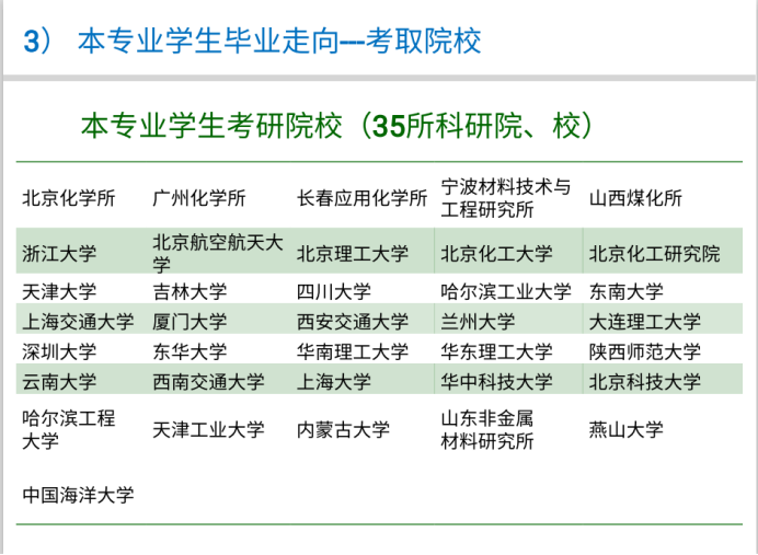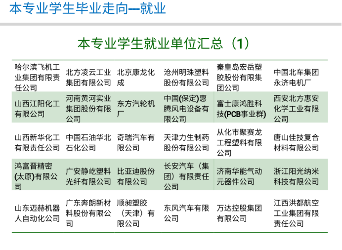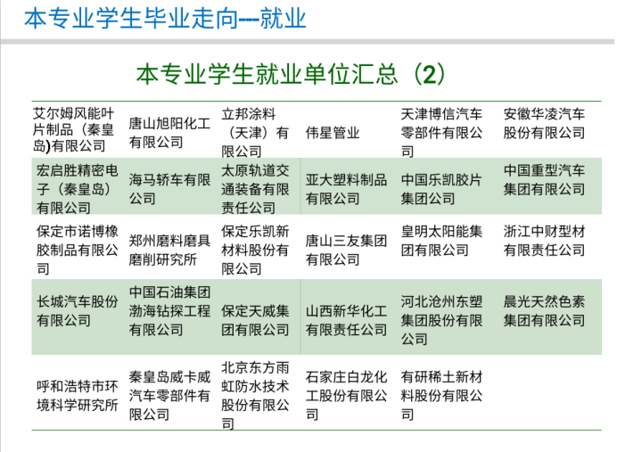 高分子材料与工程专业毕业生就业面广,可就业行业包括高分子材料生产加工、石油化工、汽车制造、生物医药、精密仪器加工、能源材料以及教育科研等领域,近几年的就业单位主要包括哈飞基团、北方凌云工业、比亚迪汽车、长城汽车、天津力生制药、立邦涂料、中石油等企业。高分子材料相关的科学研究在助力人工智能、5G建设、医疗防护等领域发挥着这关键的作用,很多本科生也选择毕业继续深造,近年来高分子专业的应届考研率保持在41%以上,主要去向包括中科院化学所、北航、川大、北化、天大、哈工大等。综合考研和就业,专业的一次就业率一直保持在95%以上。欢迎全国考生报考安博体育