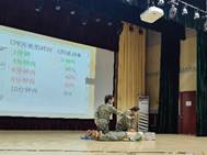 活动现场,急诊医学科团队在基础理论讲解的基础上,更为直观的急救流程演示让同学们能够迅速把相关急救理论转化为实践能力。团队用通俗易懂、轻松活泼的语言向学生们讲授了心肺复苏术、AED的操作使用方法和海姆立克急救法。按照检查意识、胸外按压、人工呼吸等步骤逐项进行,边演示边描述按压前的准备工作以及操作的各项细节要领,包括实施心肺复苏的黄金时间,胸外按压部位、频率、深度、按压与人工呼吸比例等,并就日常生活中容易出现的突发疾病急救措施与学生进行积极互动。