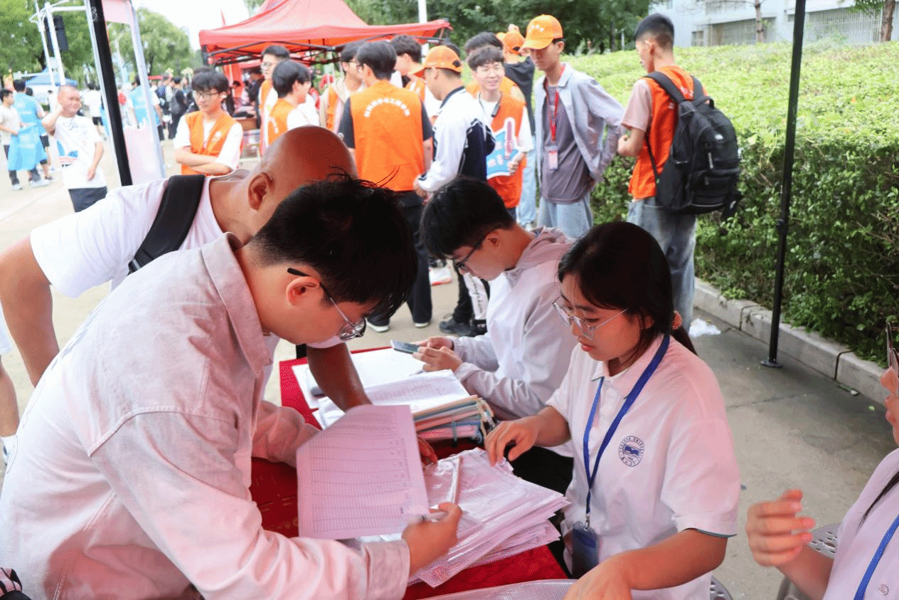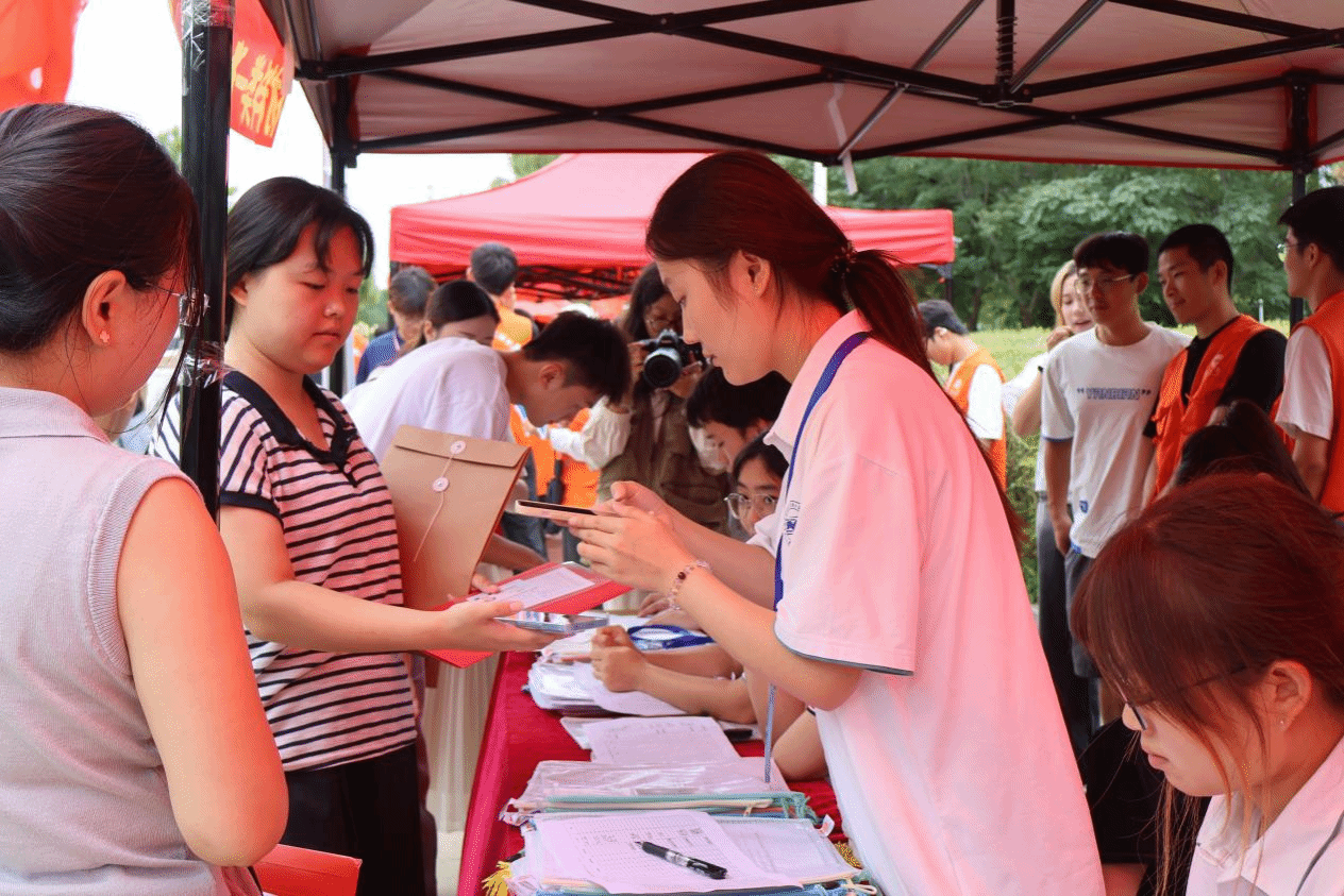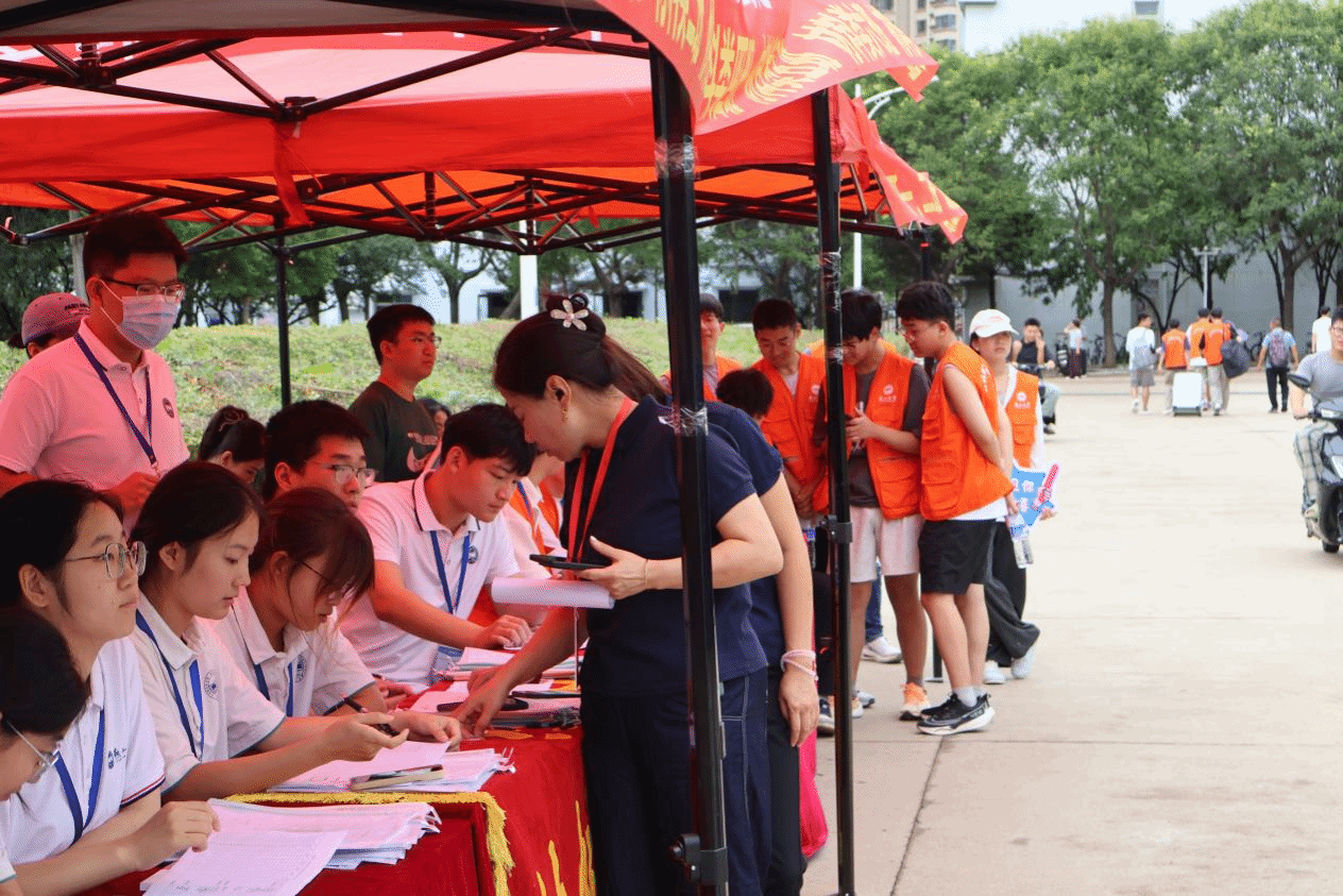 迎新点已整装待发:醒目的指引牌清晰引路,志愿者们、工作人员、老师们身着统一服装,主动接过新生的行李,耐心解答“报到流程”“宿舍位置”“校园设施”等疑问,从信息登记、材料核验到校园卡发放,每一个环节都有条不紊。