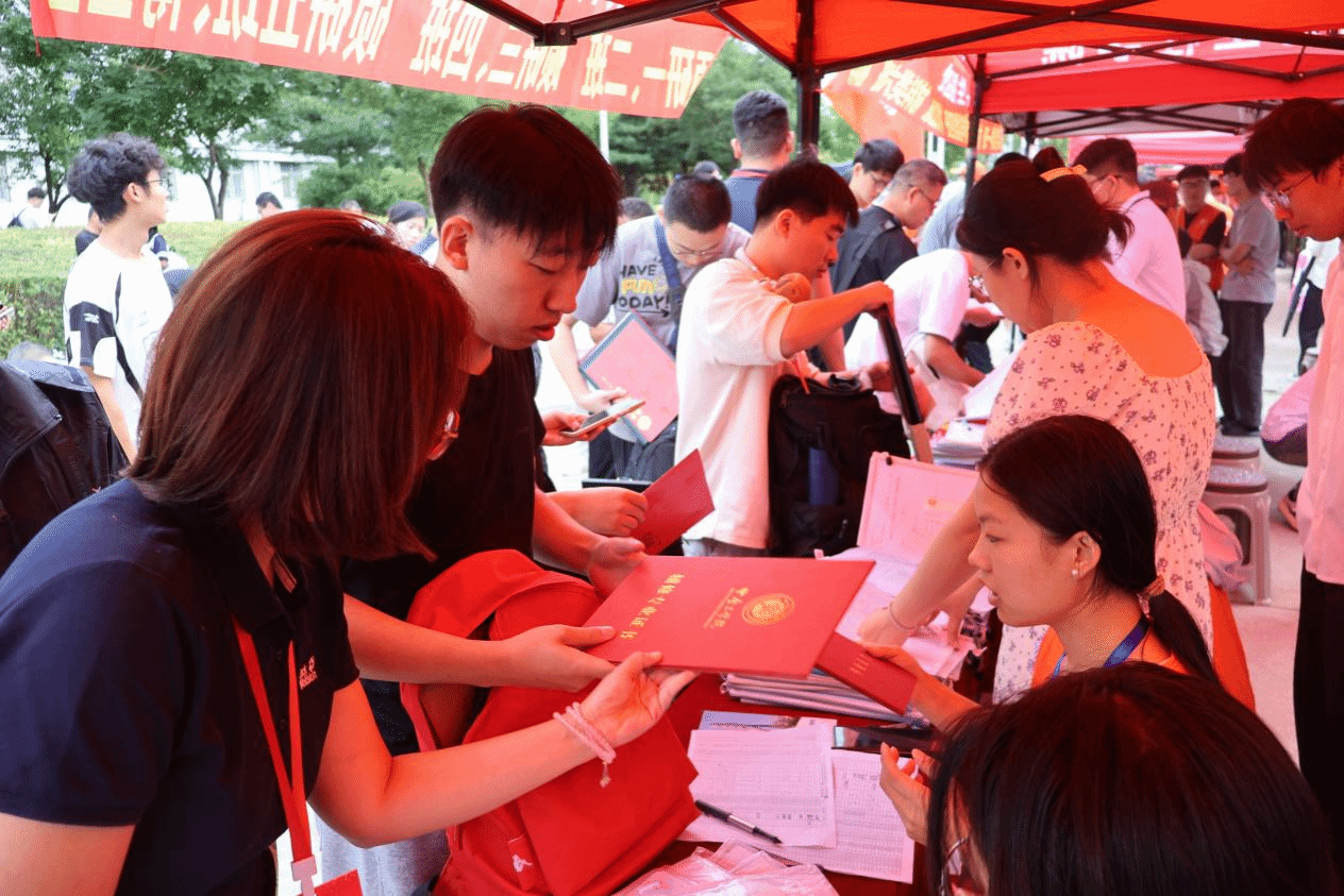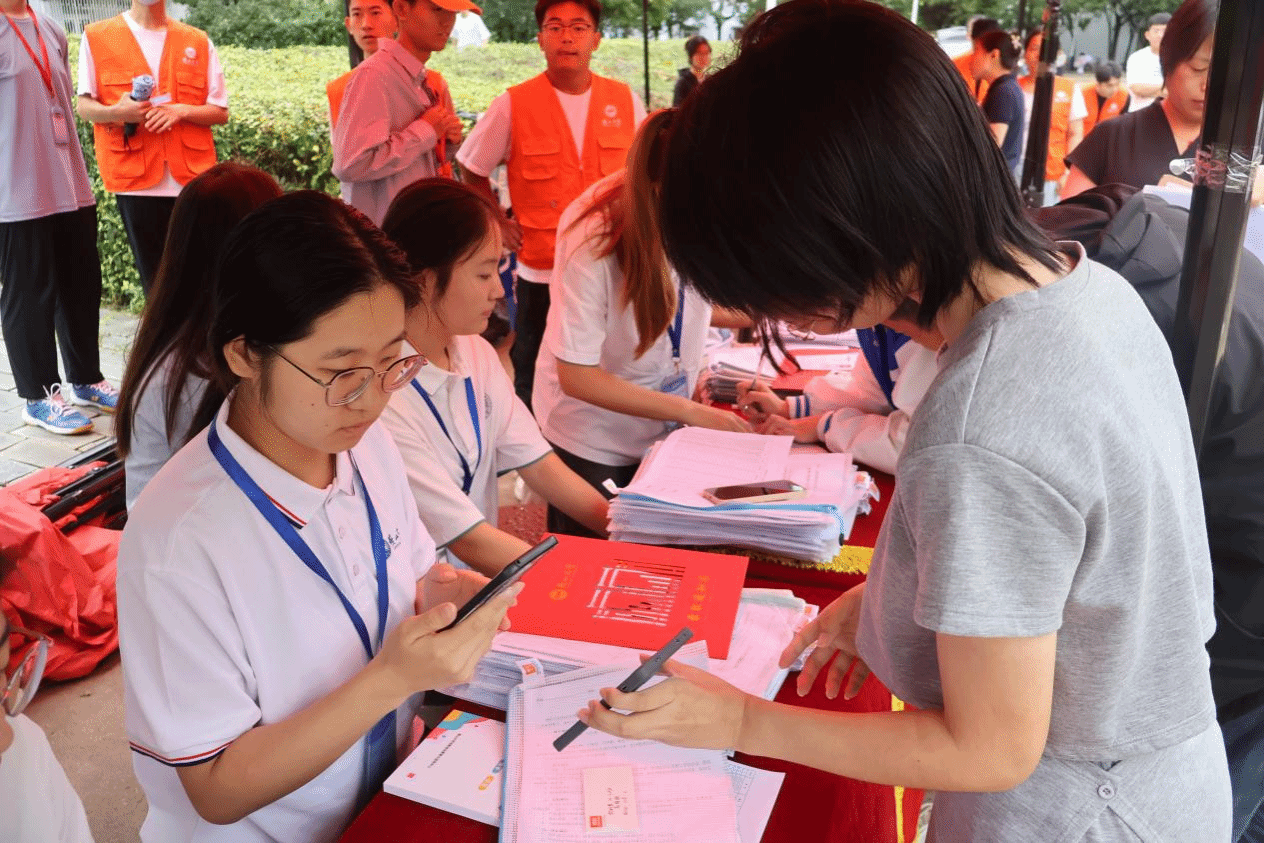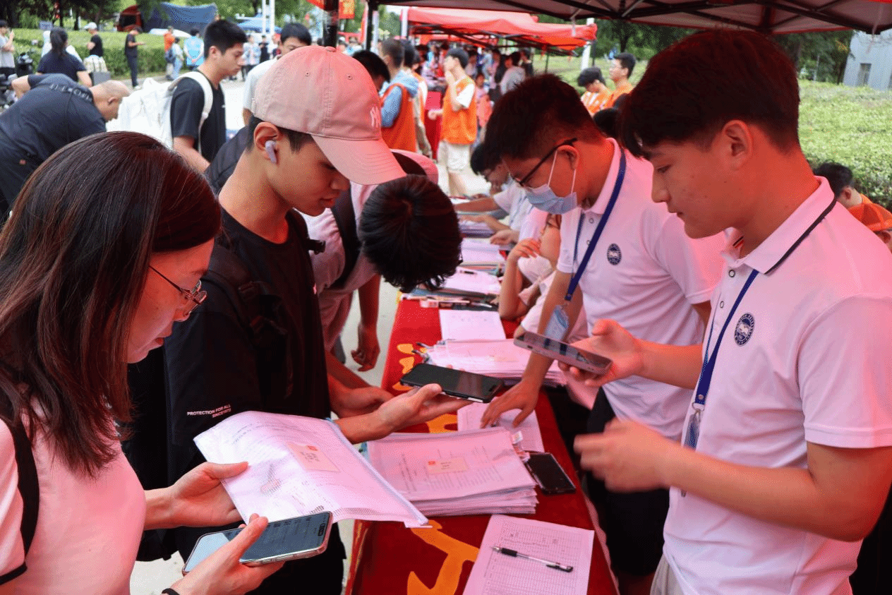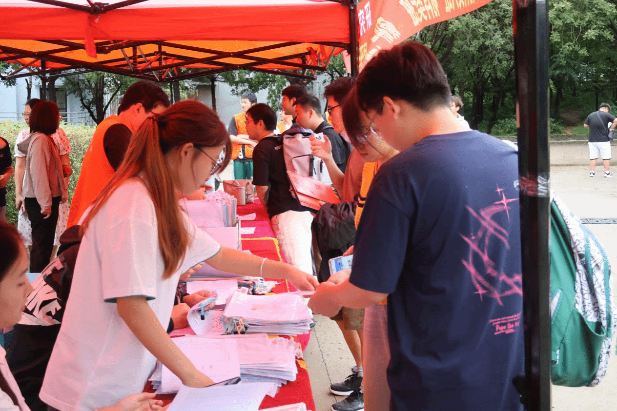 迎新点已整装待发:醒目的指引牌清晰引路,志愿者们、工作人员、老师们身着统一服装,主动接过新生的行李,耐心解答“报到流程”“宿舍位置”“校园设施”等疑问,从信息登记、材料核验到校园卡发放,每一个环节都有条不紊。