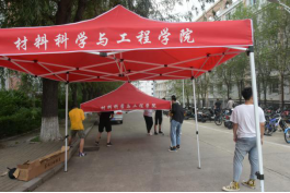 几十位志愿者在里仁七号门和十组团迎新点支起迎新帐篷,拉起横幅,为明后天的迎新工作做好准备。