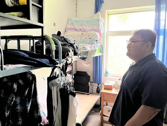 在巡查走访过程中,巡查人员关心仍未离校同学,了解同学们预计返乡时间路线及假期规划,叮嘱他们注意寝室用电安全,插排务必上墙。由于今年暑期雨水多、气温高,辅导员提醒同学们收好被褥,提前购置除湿用品,并保持寝室卫生。离寝前携带好贵重物品及证件,最后离寝的同学要仔细检查是否断电,对已全部离校的寝室进行断电检查。