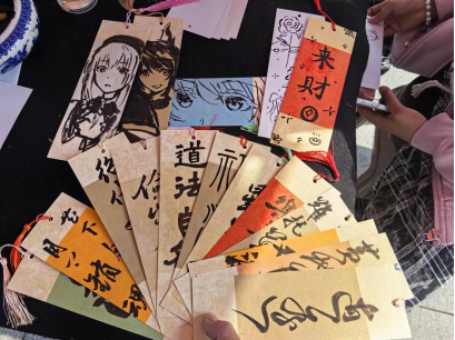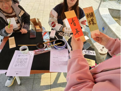 “翰墨抒怀”环节中,参与者应用所抽取到的意象提诗,十余幅古典意象签在春阳下流转—“燕山”“纸鸢”“柳絮”等诗笺承载着千年的美学密码,同学们纷纷展现才华,以诗为媒,以春为景,以“细雨湿流光”为引,在斑驳墨迹中晕染出暮春惆怅;或巧思化用“丁香空结雨中愁”,令抽象诗境跃然纸上。这场跨越时空的诗词对话,使古典文学基因与青春创意迸发璀璨花火。经大众投票获奖的前10名将获得大学生书法协会手书的书法相框。