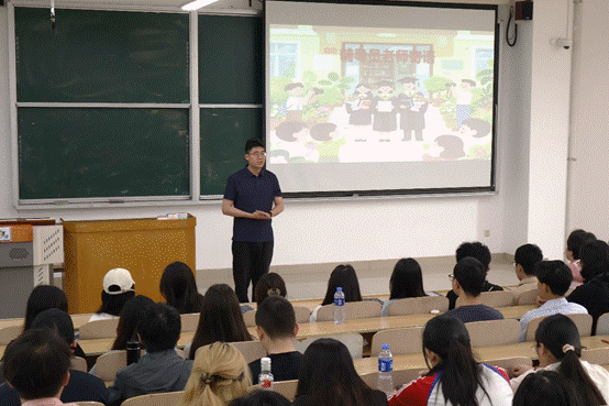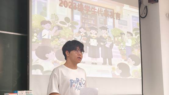 2023级学生柳圣凯代表全体2023级本科生向朋辈班主任表达了感恩与不舍。他动情地说:“记得那次深夜求助学长拍摄一组祝福视频。凌晨十二点,教室背景的视频如约而至,那一刻的震撼,让我深刻体会到了你们背后的努力与坚持。这份精神,如同璀璨星辰,照亮了我们前行的道路,激励着我们不断攀登,勇往直前。”