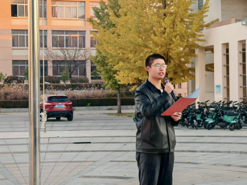 升旗仪式后,材料3班周济帆同学以《赓续先驱红色脉,青春笃行践初心》为题发表演讲。他结合秦皇岛的红色历史、李大钊先生的革命精神与田永君院士的科研坚守,号召材料学子将个人理想融入国家发展,以科技创新筑牢强国根基,字字铿锵,引发全场共鸣。